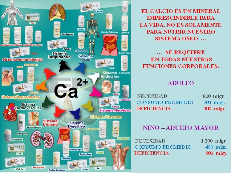 El calcio desempeña un papel importante en la formación y el desarrollo de huesos y dientes, ayuda a la coagulación de la sangre, la contracción muscular y en la transmisión de los impulsos nerviosos.
